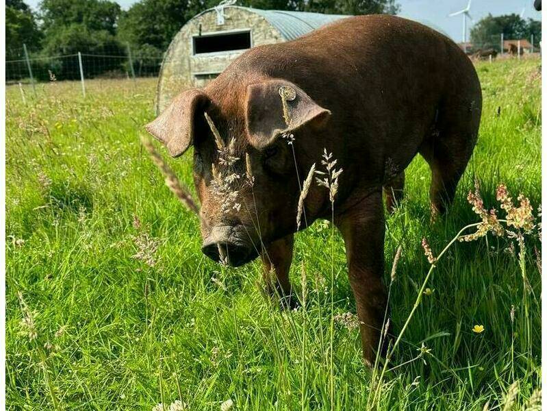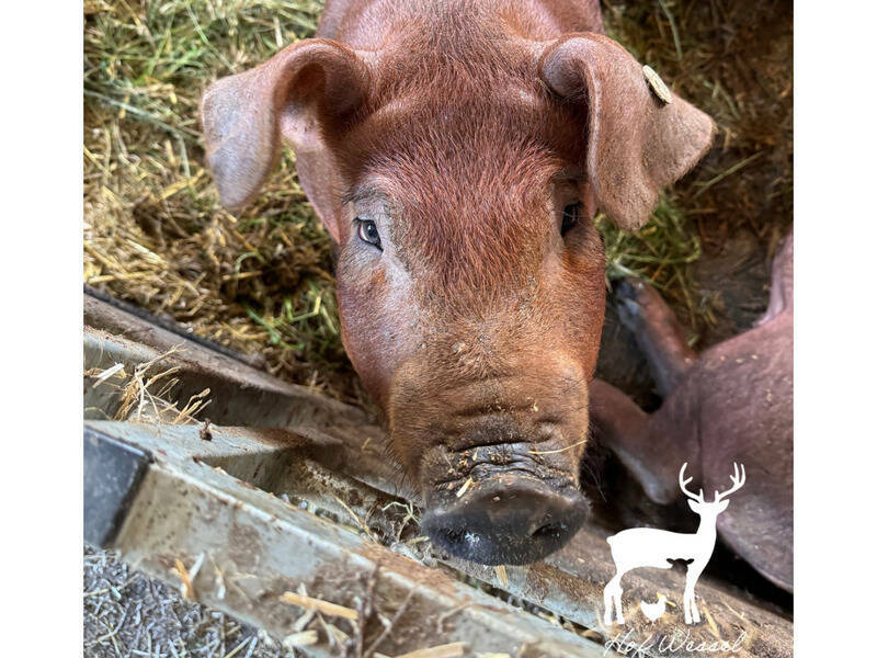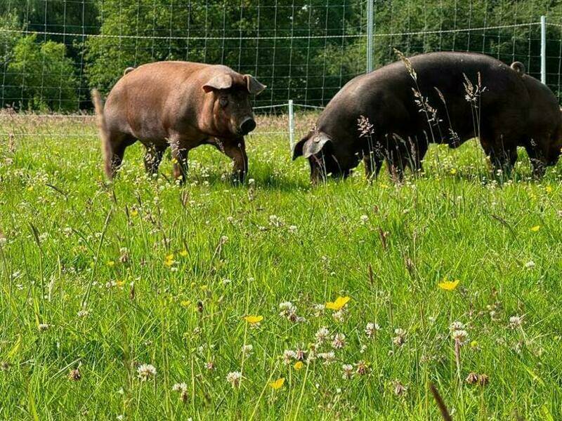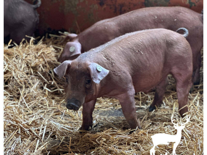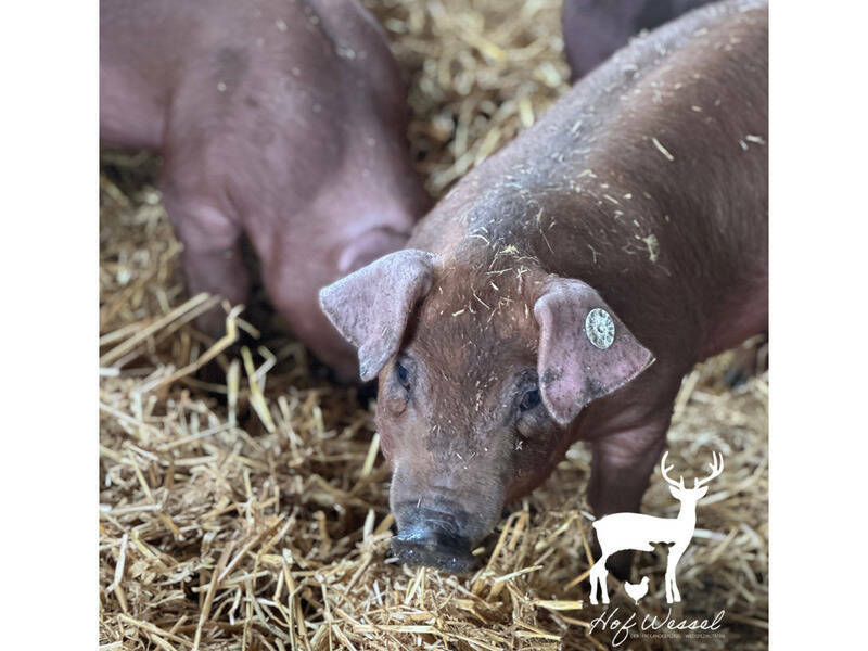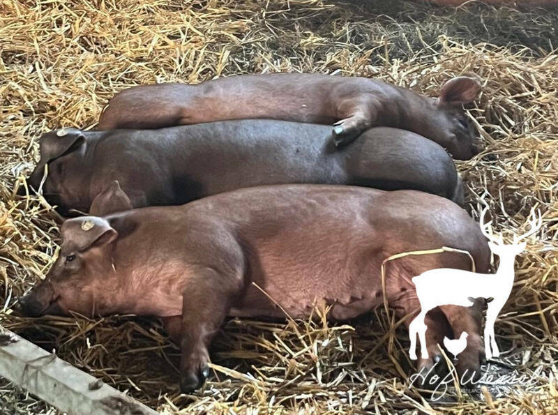 Unsere Duroc-Schweine wachsen in einer naturnahen Umgebung auf, in der sie sowohl Zugang zu großzügigen Strohställen als auch zu weitläufigen Freilandflächen haben. Diese artgerechte Haltung ermöglicht es den Tieren, ihre natürlichen Verhaltensweisen auszuleben und sich stressfrei zu entwickeln. Durch die Kombination von Stroh- und Freilandhaltung gewährleisten wir eine hohe Lebensqualität für unsere Tiere. Unser Ansatz minimiert Stress und fördert das Wohlbefinden der Schweine, was sich positiv auf die Fleischqualität auswirkt.